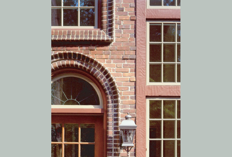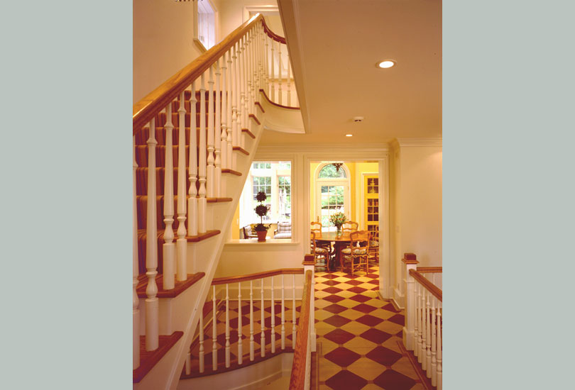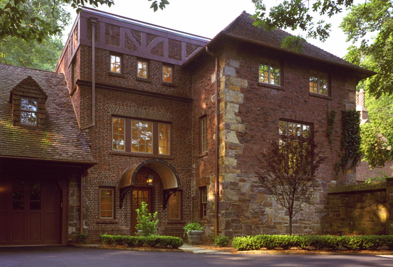 An exterior porch between the garage and service wing was removed and replaced by a three-storey brick structure. The townhouse-like addition is punctuated by hand carved tudor-boards infilled with brick "nogging," taking cues from both the crenelated main entry tower and other details of the house by elaborating on Eyre's vocabulary of robust brick and stone details. The addition includes two stairs linked by an open bridge that spans from the entry to a new double height Breakfast Room and adjacent Kitchen.