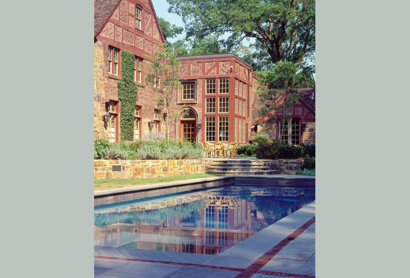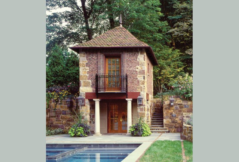 A sequence of outdoor spaces surrounded by stone walls extends the view from the Breakfast Room past a sunken pool and culminates in a new two-storey pool pavilion. The Poolhouse, includes a Kitchen on the lower level and a changing room above, capped by a hipped roof of the same rustic clay tile as the main house.
