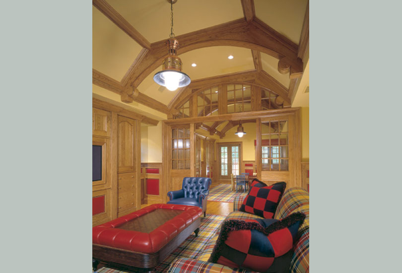 A new Family Room created by combining former servant's pantry and food preparations areas is given a larger scale with enlarged windows and a higher ceiling by lowering the floor three steps into the basement.